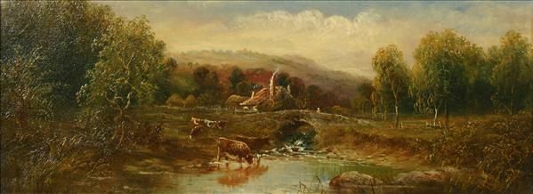 Cattle watering by a bridge and cottage