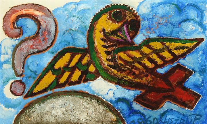 Composition with flying figure and a question mark