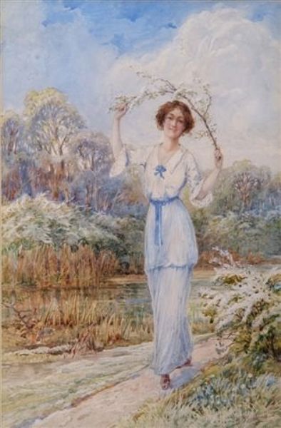 A young lady walking beside a lake and holding a blossom branch