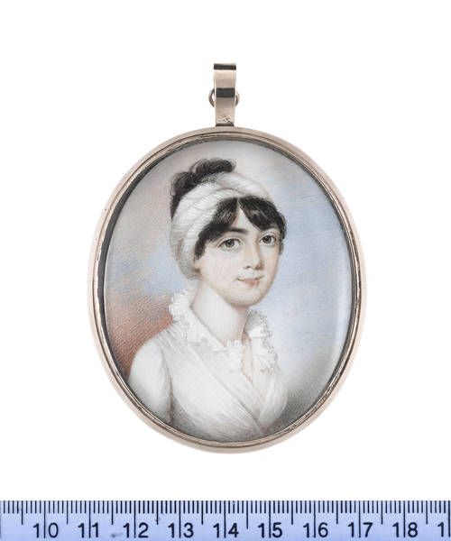 | A Lady, wearing white dress, with frilled collar, her dark hair upswept and held in place with a white twisted kerchief. | |