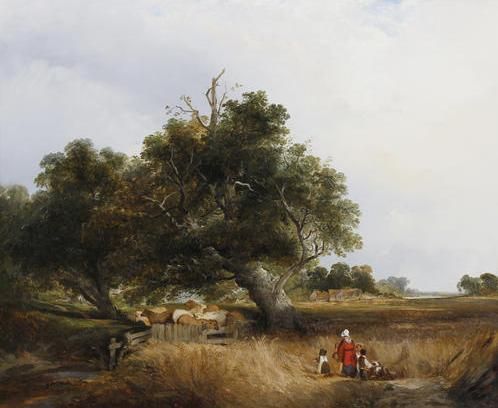 Harvest landscape with family in a cornfield and sheep penned nearby
