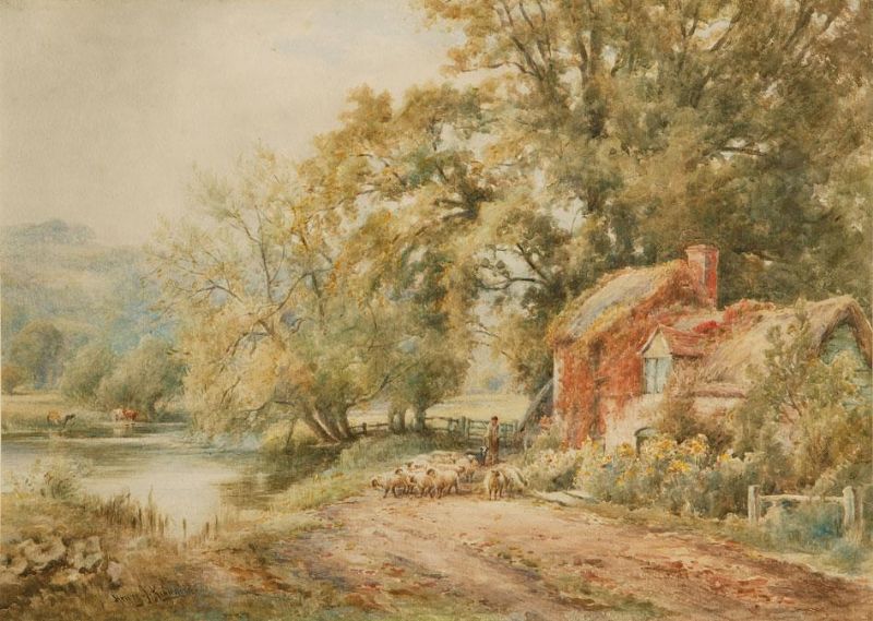 | A rural landscape with a flock of sheep and shepherd by a river, with thatched cottage and trees, | |