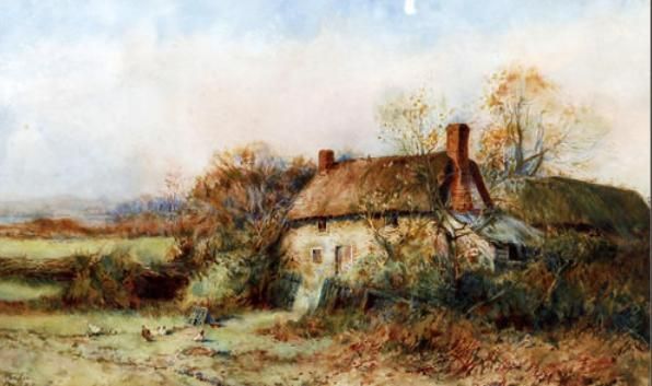Thatched cottage with chickens before