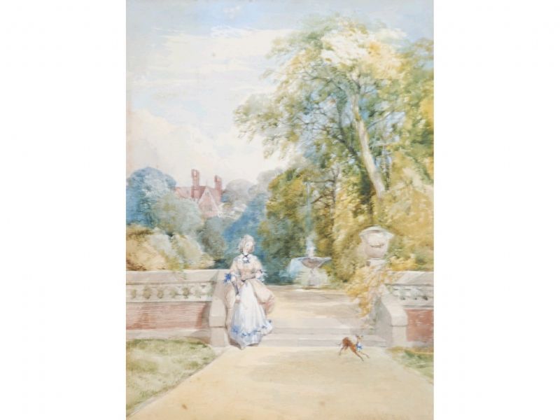 | An elegant lady possibly in mourning with her pet dog in an ornamental garden, country house beyond | |