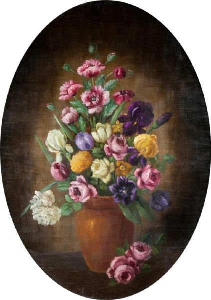 Still Life of Flowers, pink poppies, roses, irises and tulips in a brown vase