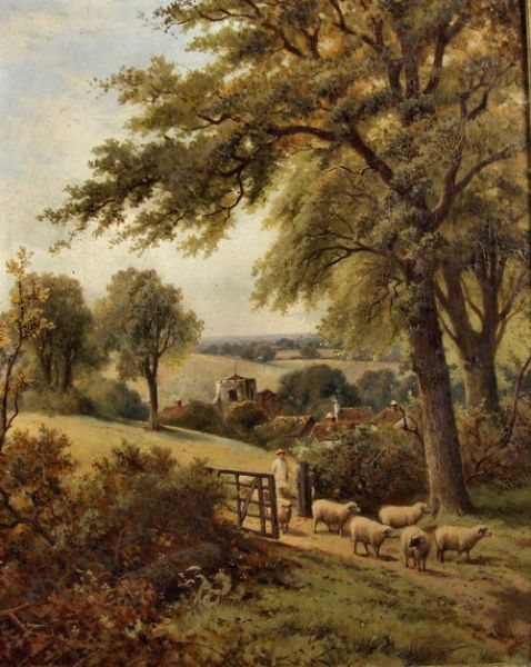 | Country landscape with sheep and shepherd to foreground, and river landscape with a figure standing on a wooden bridge to foregr | |