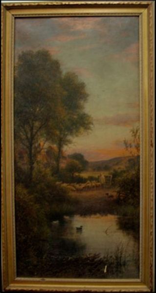 SHEPHERD AND FLOCK BY POND WITH DUCKS