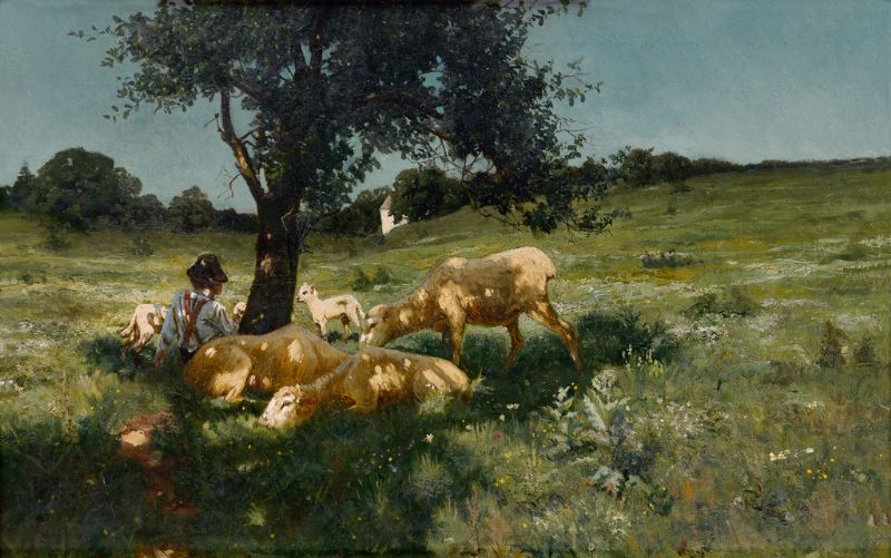 Boy and Sheep under a Tree.