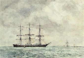 | A windjammer at anchor with the sun breaking through the clouds | |