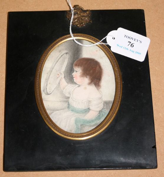 | Oval Portrait Study of a Child wearing a White Dress with Green Sash, holding a Hoop beside a Column | |