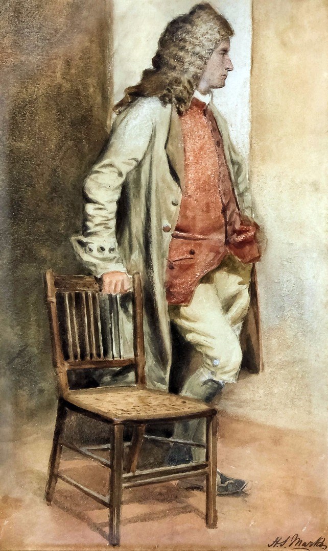 | Full length portrait of bewigged gentleman in 18th Century dress standing beside a chair | |