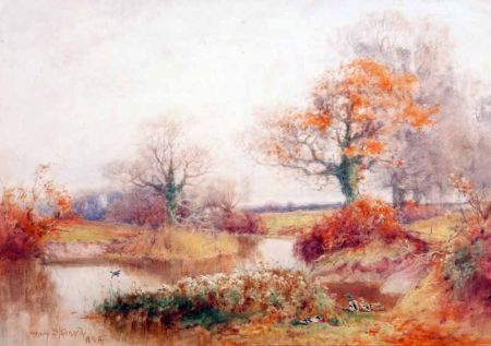 An Autumnal River Landscape with Ducks on a Bank