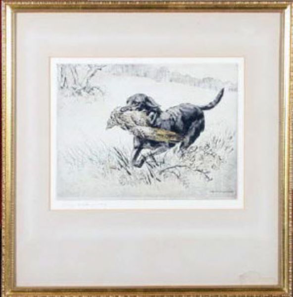 A black Labrador retrieving a pheasant
