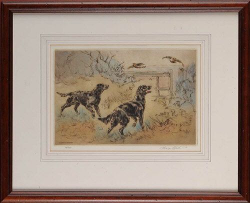 TWO BLACK GUN DOGS AND PARTRIDGES