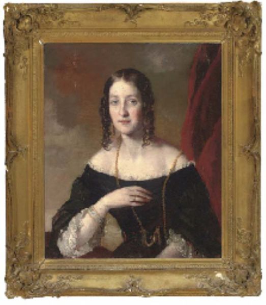 | Portrait of a lady, half-length, in a black dress with white lace trim, a watch on a gold chain attached to her waist, before a | |