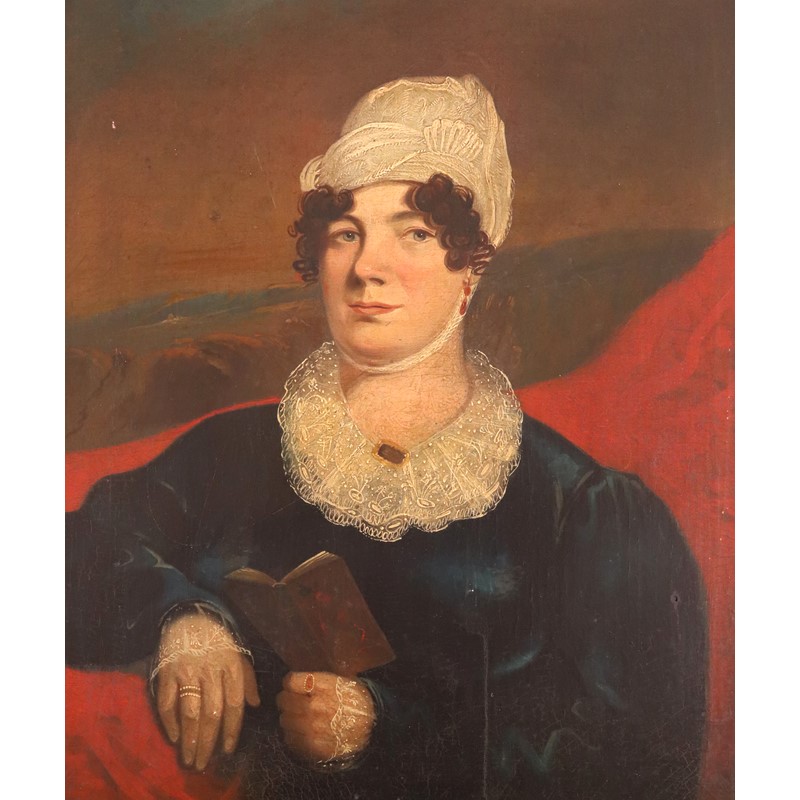 | Portrait of lady in a white Regency bonnet and blue dress reading a book | |