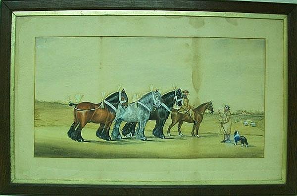 | landscape scene with three shire horses and a smaller mounted horse facing a farmer and sheep dog in a field with sheep in the b | |