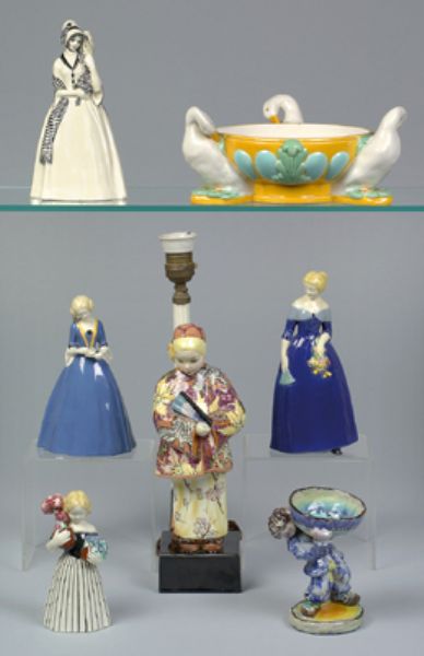 | Ceramic ware, the off-white body with polychrome painted decoration, metal mount | |
