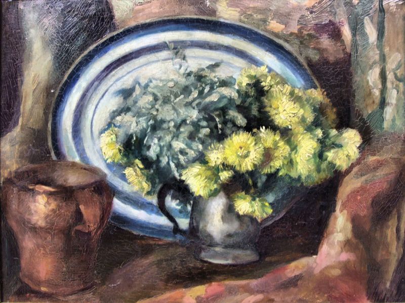 | Still life with blue and white oval plate, tankard of Michaelmas daisies and a copper pot | |
