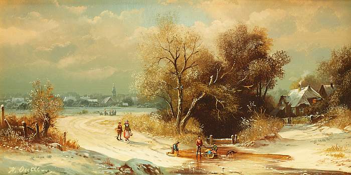 Winterliche Landschaft mit Schneevergnügen, im Hintergrund Dorflandschaft