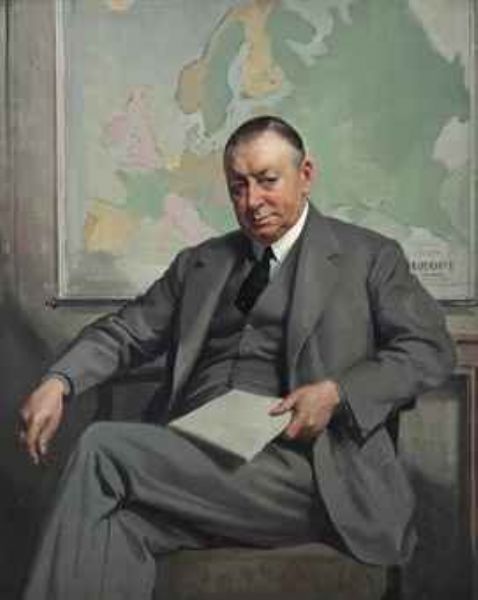| Portrait of Edward Verrall Lucas (1868-1938), seated three-quarter-length, in a grey suit and tie, with a map of Europe | |