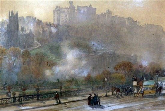 | An omnibus and figures below Edinburgh Castle | |