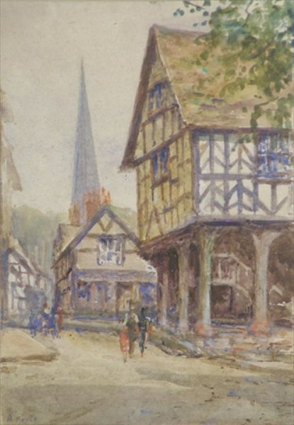A view, Church Walk, Ledbury, with figures before timbered buildings and background spire