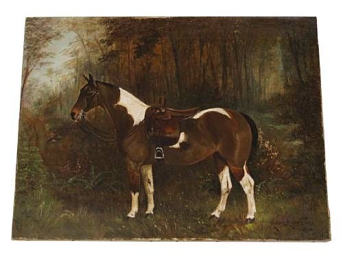 Study of a saddled skewbald horse