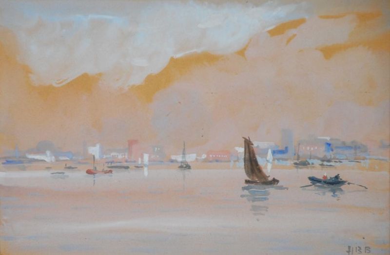 Coastal townscape with sailing craft