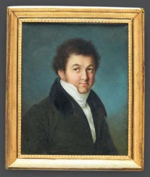 Portrait d'un jeune homme en redingote grise à col de velours bleu, en buste vers la droite et coiffé de mèches