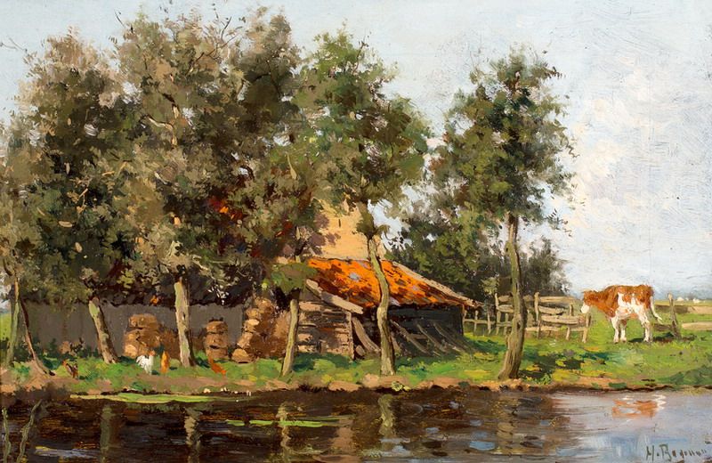 Koe en kippen bij boerderij aan een sloot