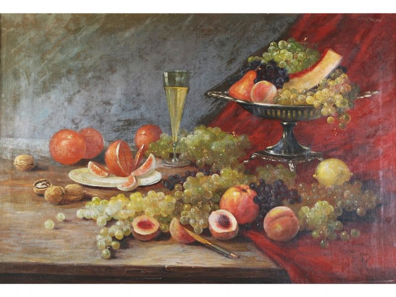 Still life, fruit, nuts, wine glass and comport on a table