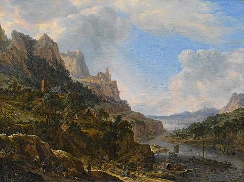 | A Rhenish riverlandscape with a figures loading barges in the foreground and travellers resting on a hillside nearby | |