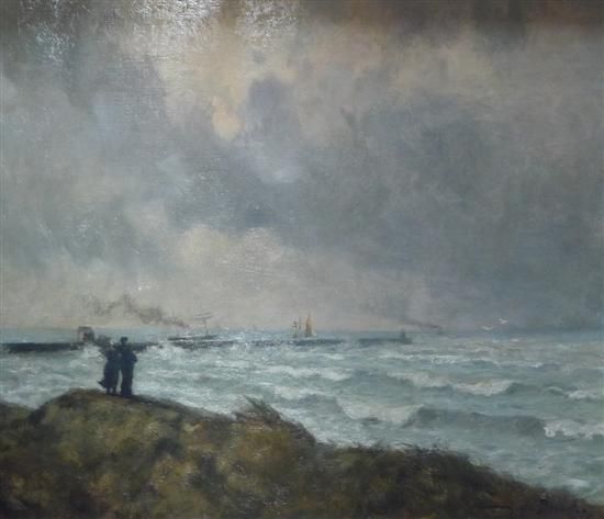 Coastal landscape with figures on the shore and steamers