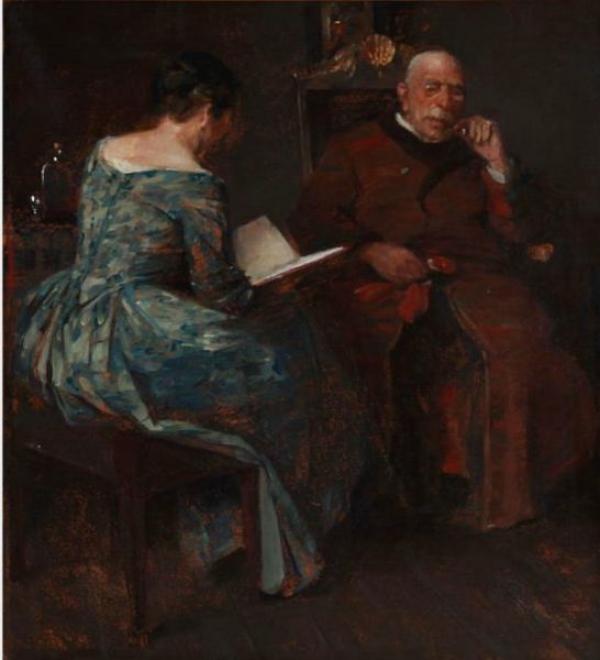 | Evening atmosphere in a living room, where a lady is reading for a man | |