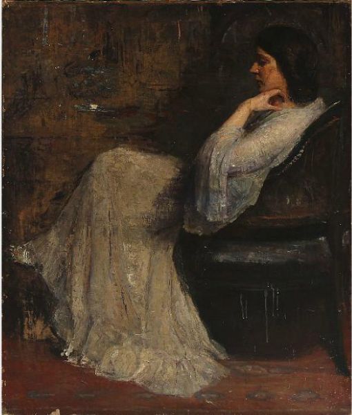 The wife of the artist in a white dress