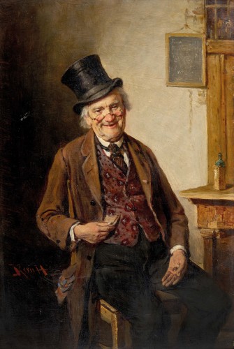 Sitzender Mann mit Zylinder, Geldnote und Münze.