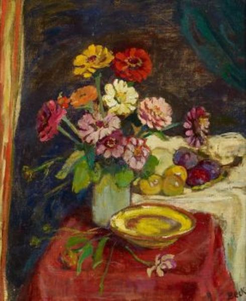 Mutter mit Kind am Spinnrad vor dem Kachelofen