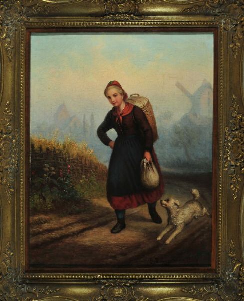 | Reisendes Mädchen mit umhertollendem Hund, im Hintergrund eine Stadt im Morgennebel | |
