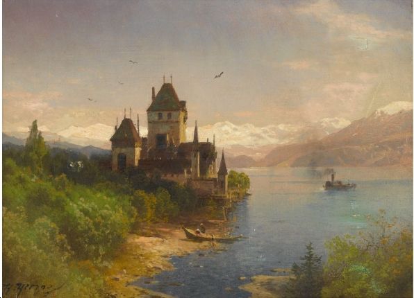 CASTLE BY A LAKE WITH A PADDLE STEAMER