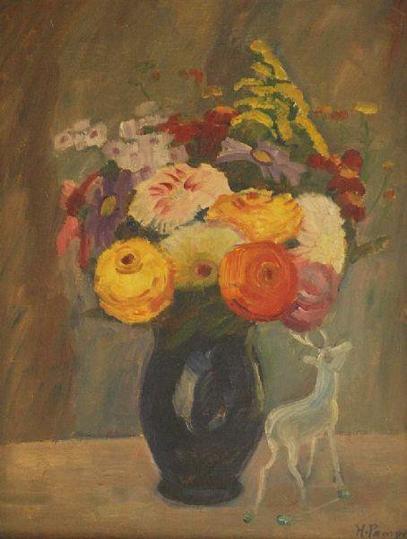 Blumenstilleben mit blauer Vase und kleiner Tierfigur "Hirsch aus Glas