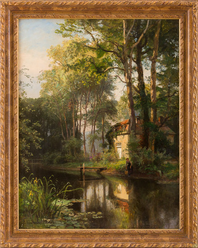 | Kleines barockes Jagdschloss zwischen Bäumen an kleinem Fluss mit Holzsteg | |
