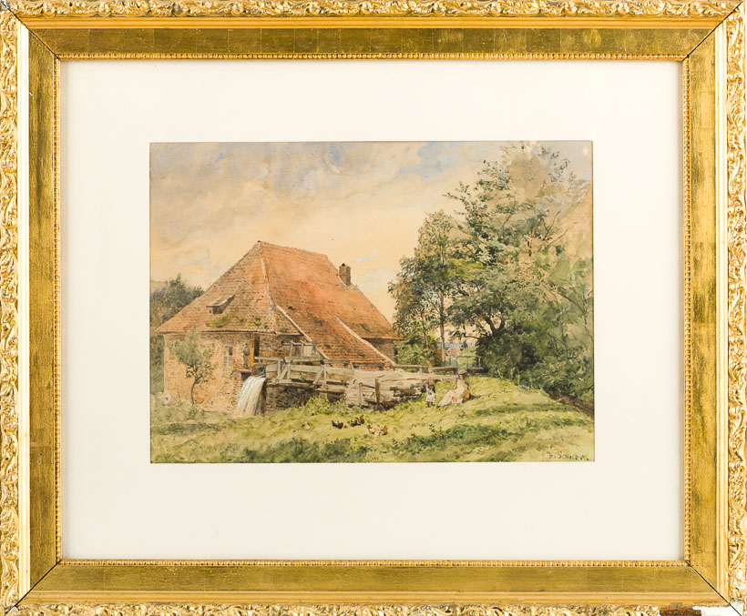 Wassermühle in Thüringen. Auf der Wiese Mutter mit 2 kleinen Kindern und Hühnern