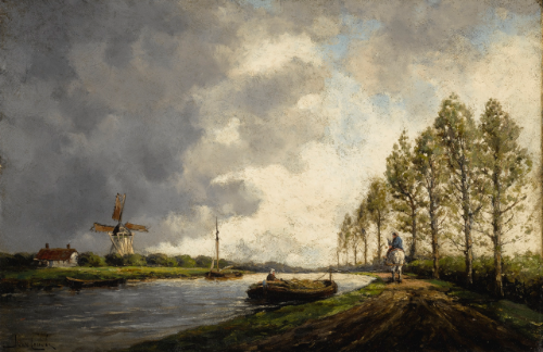 | A RIVER LANDSCAPE WITH A HORSEMAN ON A PATH AND WINDMILLS BEYOND | |