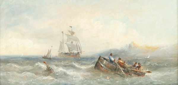 Schepen voor de kust, op de voorgrond een sloep