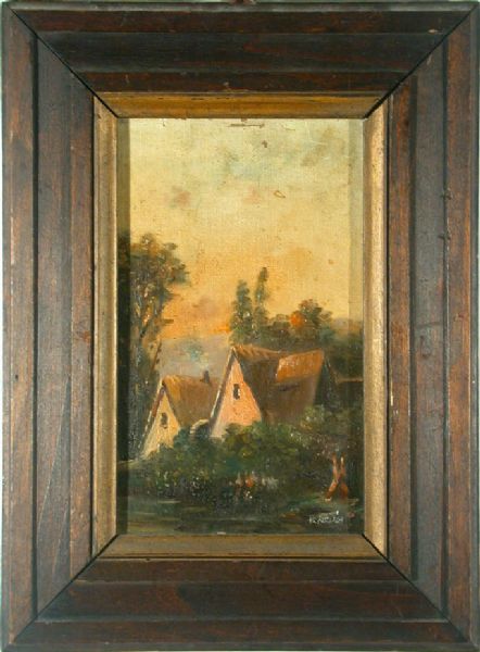 Von Bäumen umgebene Mühle und Wohngebäude im Licht der untergehenden Sonne