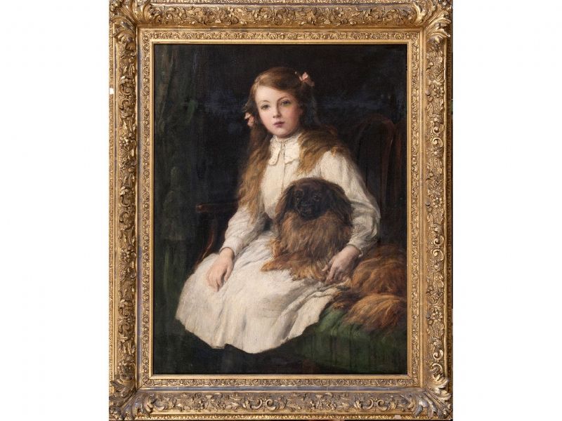 PORTRAIT OF A GIRL WITH HER PET PEKINGESE
