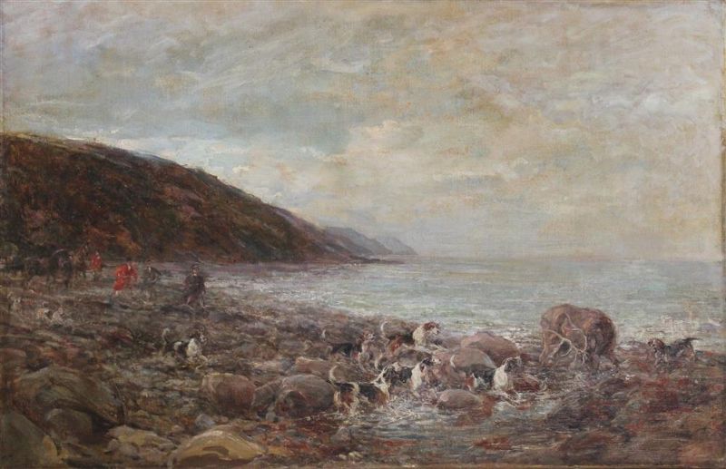 DOGS CORNERING A STAG ON A ROCKY COAST