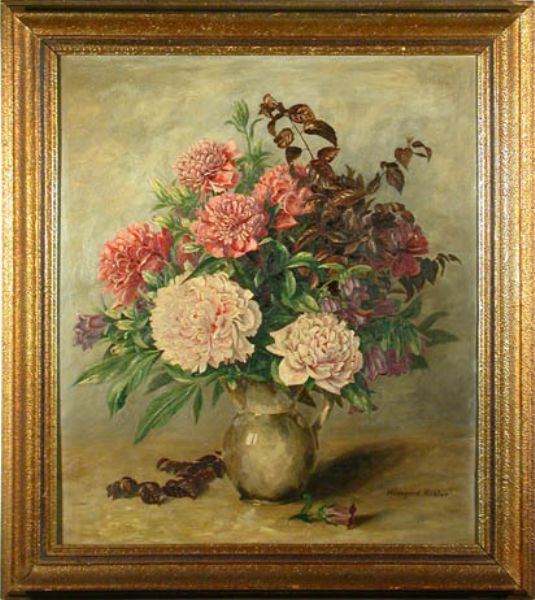 Prächtiger Herbstblumenstrauß in einem Tonkrug vor changierendem Hintergrund