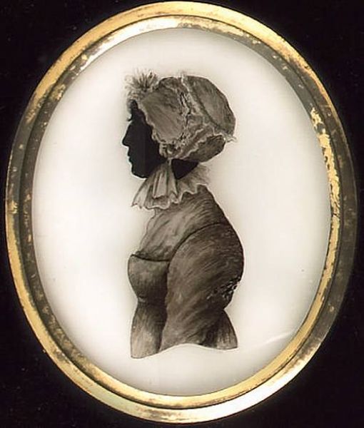 | A silhouette of a Lady, profile to the left wearing dress with fill-in and bonnet tied beneath her chin | |